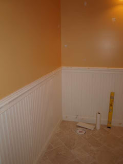 The powder room is also almost done... We have recently finished the tile in that bathroom... It was a last minute decision to do it one night... we had originally planned on putting slate on the floor in that bathroom, but after thinking about how much of a pain in the @$$ it would be to clean it, we went to Lowes and picked out a very light beige marble with green and orange tones... LOVE IT... Since it was natural stone we were able to cut the 12 x 12 tiles in half and quarters and made a nice pattern... no long straight lines in our house :P Then we decided to put wainscot in the bathroom... I picked it up with some paint and Amy came over one day and started it for me... I finished and then Tommy and I installed it one day... It is all caulked, puttied and painted... The vanity is in the bathroom, but needs to be hooked up... and the mirror is hung... LOVE how it looks.
