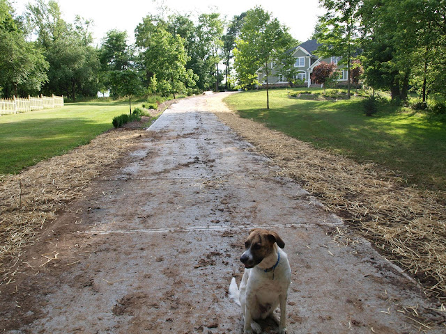 I put grass seed and then on Monday Tom's parents came and were able to get some straw to put on the top. Most importantly along the street and near the stream so that we don't get in trouble for making mud.